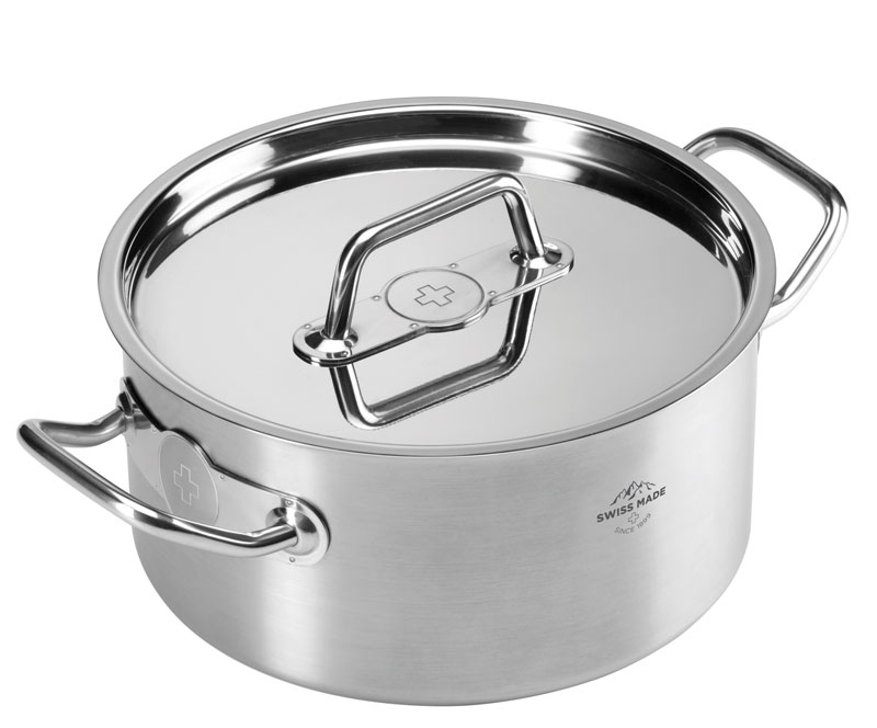 Die Schweizerkreuz-Prägung an den Seitengriffen und Deckeln spiegeln zeitlose Eleganz wider. Dank der Liter-Innenskalierung bei allen Töpfen kann direkt in dem Kochgeschirr die Flüssigkeitszugabe abgemessen werden - kein separater Messbecher wird mehr benötigt.