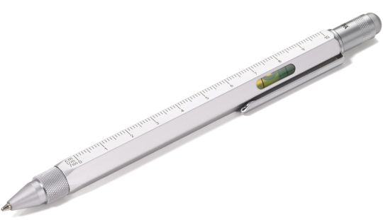 Planungshilfe und Werkzeugkoffer in einem! Der Multitasking-Kugelschreiber CONSTRUCTION hat wirklich einiges drauf- und drin. Verschiede Skalen, Zentimeter- und Zoll-Lineal, Schlitz-/ Kreuzschraubendreher, Stylus und Wasserwaage.