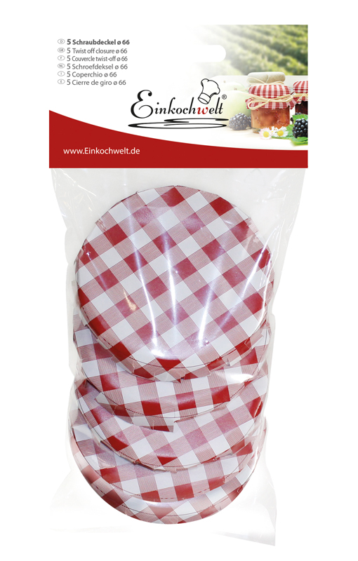 Einkochwelt 5er Beutel 66 mm Caps past dunkelrot/weiß kariert
