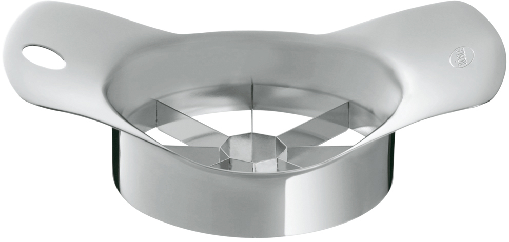 Obst oder Gemüse wird in acht gleichgroße Stücke zerteilt. Das Kernhaus wird separat herausgeschnitten. Die breiten Griffe geben guten Halt und sorgen für optimale Kraftübertragung. Ideal für Äpfel und Birnen, aber auch Kartoffeln.