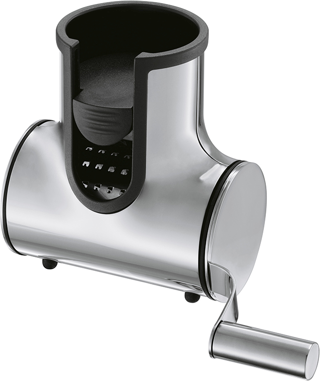 Käsemühle mit geschärften Reibeplatinen zum schnellen und effizienten Reiben von Käse und Schokolade. Verschiedene Reibe-Einsätze (fein und mittel) erhältlich. Zerlegbares Edelstahlgehäuse zum einfachen Reinigen.
