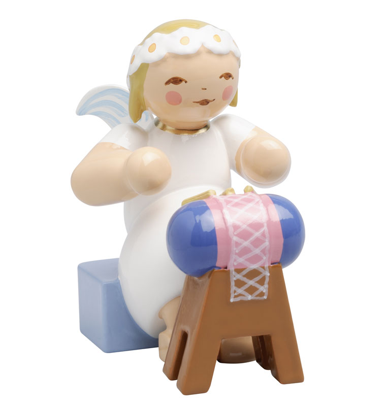 Mit ihrem kindlichen Gesichtsausdruck, einem zarten Figurenkörper sowie einem Margeritenkranz im blonden Haar sind die MARGERITENENGEL eine der bekanntesten Reihen aus dem Hause WENDT & KÜHN. Ob mit Instrument, Spielzeug oder Backwerk ausgestattet, ob als stehende Figur oder auf blauem Bänkchen sitzend... die fleißigen Engelchen sind die heimlichen Helfer des Weihnachtsmannes, die jedes Jahr mit Fleiß und Eifer dafür sorgen, dass die Kinder zu Weihnachten die schönsten Überraschungen erleben. Der SITZENDE MARGERITENENGEL MIT KLÖPPELSACK sitzt dabei ganz vertieft bei seiner Arbeit.