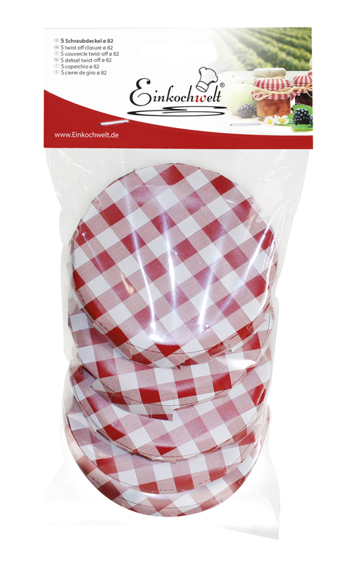 Einkochwelt 5er Beutel 82 mm Caps past dunkelrot/weiß kariert