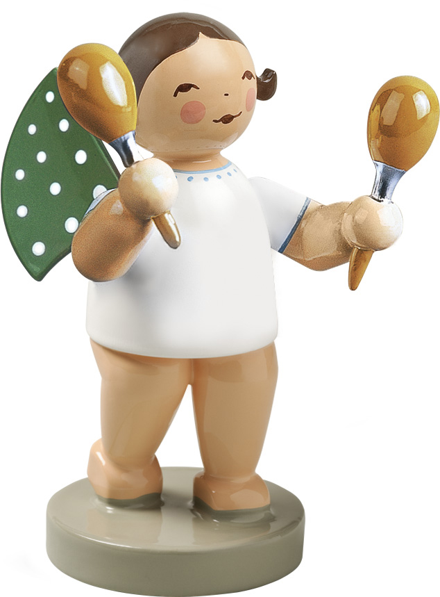 Die Grünhainichener Engel aus dem Hause WENDT & KÜHN verzaubern mit ihrer Gestalt, ihrem Ausdruck und ihrem Charme. Ihr Markenzeichen sind die elf weißen Punkte auf ihren grünen Flügeln. Die musizierenden Orchesterengel wie der ENGEL MIT MARACAS erhalten bei Sammlern vor allem in der Weihnachtszeit ihre große Bühne und erfreuen mit ihrem festlichen Konzert.